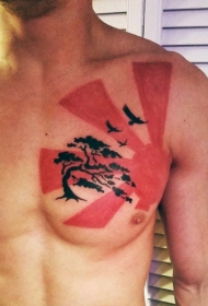 胸部亚洲风格的红太阳和黑色树小鸟纹身图案