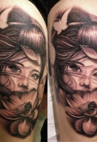 大臂亚洲风格黑白写实女人与花朵纹身图案