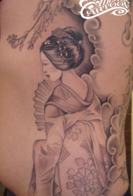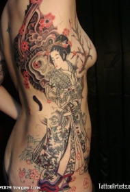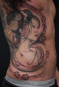 侧肋可爱诱人的亚洲艺妓花卉纹身图案