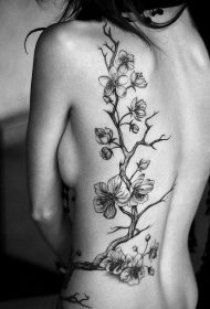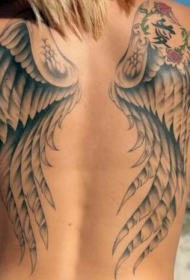 背部亚洲风格的黑白小翅膀与符号纹身图案