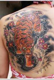 背部亚洲风格的彩色恶魔老虎纹身图案