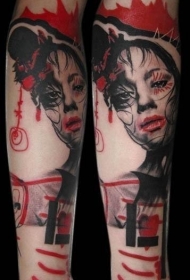 小腿不寻常的五彩亚洲女人肖像纹身图案