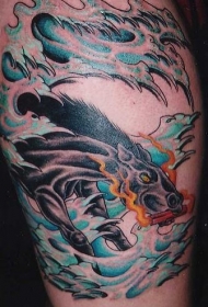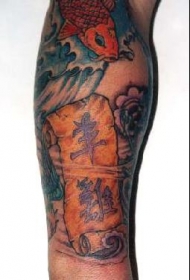 手臂彩色汉字和锦鲤鱼纹身图案