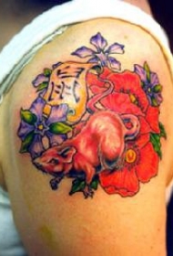 亚洲彩色花朵和大鼠纹身图案