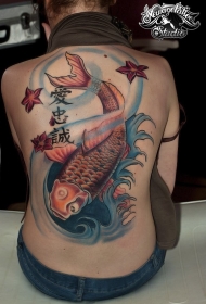 背部亚洲风格的彩色鲤鱼花朵字母纹身图案