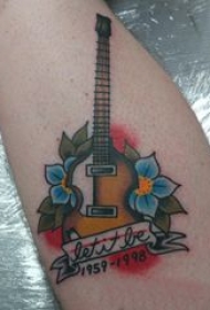 吉普森吉他纹身 男生小腿上花朵和吉他纹身图片