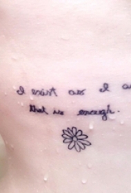 女生侧腰上黑色简单抽象线条英文和花朵纹身图片