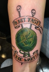男生手臂上彩绘渐变几何简单线条英文和毛线球纹身图片
