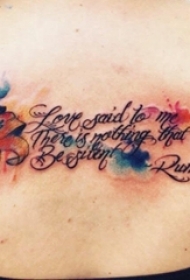 女生后背上彩绘泼墨简单个性线条英文和植物花朵纹身图片