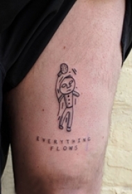 男生大腿上黑灰点刺简单线条英文和卡通人物纹身图片