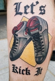 男生小腿上彩绘几何简单线条英文和鞋子纹身图片