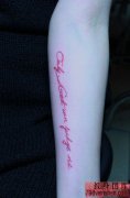 红色英文字母手臂纹身作品