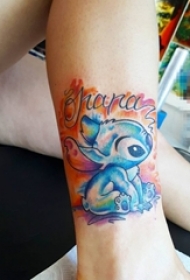 女生小腿上彩绘渐变英文单词和卡通人物史迪仔纹身图片