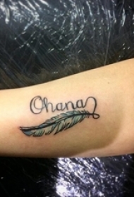 女生手臂上黑色无限大符号英文单词和羽毛纹身图片