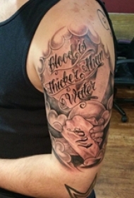 男生手臂上黑灰点刺抽象线条花体英文半袖纹身图片