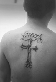 女生背部彩绘水彩文艺花朵和黑色花体英文纹身图片