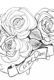 黑色线条素描唯美花朵花团和花体英文纹身手稿