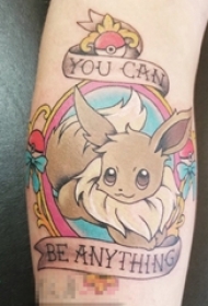 女生小腿上彩绘英文单词和神奇宝贝纹身图片