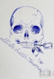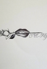 个性的黑色英文短句和嘴唇咬玫瑰纹身手稿