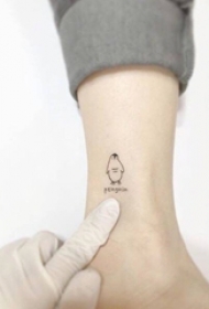 女生小腿上黑色英文单词和小动物企鹅纹身图片