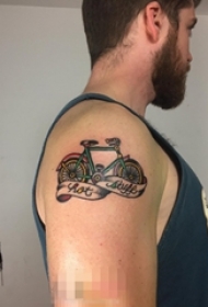 男生肩部彩绘点刺技巧英文单词和自行车纹身图片