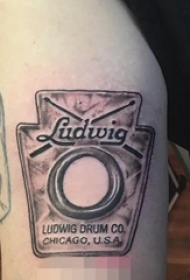 男生手臂上黑灰几何元素抽象线条英文单词和徽章纹身图片