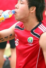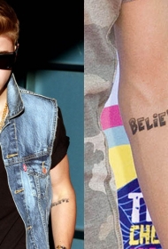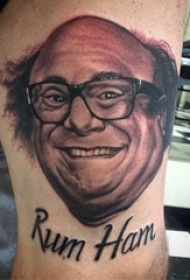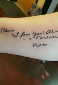 男生手臂上黑白点刺技巧生动的人物肖像和英文单词纹身图片
