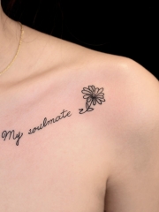 锁骨处个性英文与花朵纹身图案