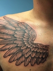男性锁骨上的英文字和右胸部上的一只天使翅膀纹身图片