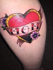 小腿上彩色传统风格英文纹身单词和爱心纹身图片