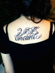 美女后背的花体英文字母纹身图片