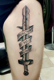 大腿纹身男 男生大腿上英文和长剑纹身图片