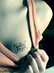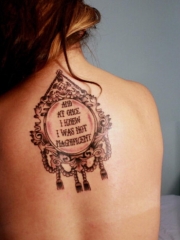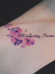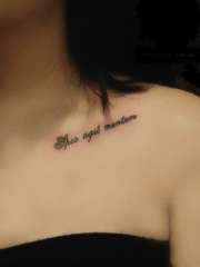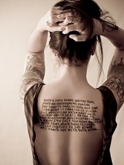 女子背部脊椎骨上一行红色的英文字纹身图片