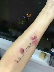 小清新英文与樱花结合的手臂纹身图案