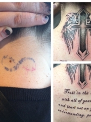 女孩后颈部帅气的多英文字和翅膀十字架覆盖纹身图片