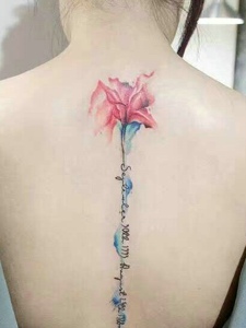 百合花与英文一起的脊椎部纹身刺青