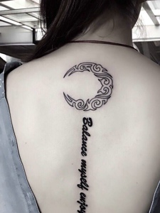 月亮与英文结合的脊椎部纹身图案