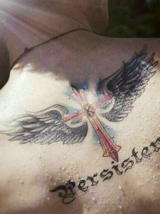 男士后背英文与十字架羽毛纹身图案