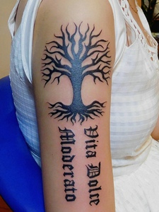 小树与英文单词一起的手臂纹身刺青