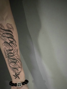 手臂内侧花体英文纹身刺青很时尚
